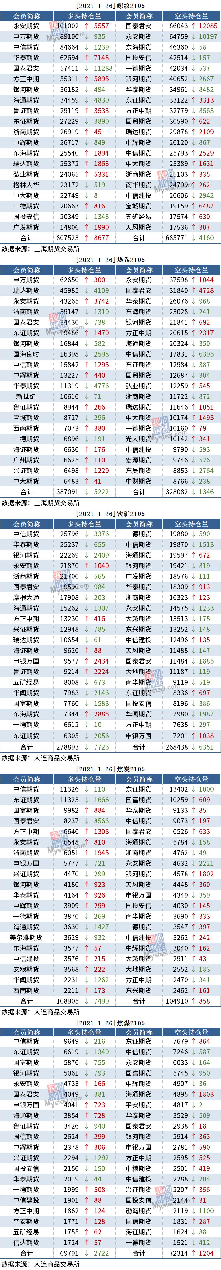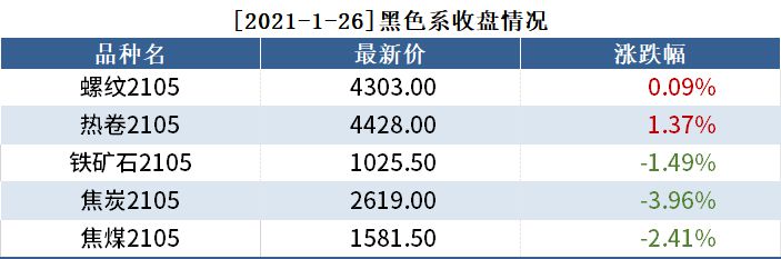截至1月26日收盘,螺纹2105收4303,涨0.09%;热卷(4428, 60.00, 1.37%)2105收4428,涨1.37%;铁矿(1026, -15.50, -1.49%)石2105收1025.5,跌1.49%。