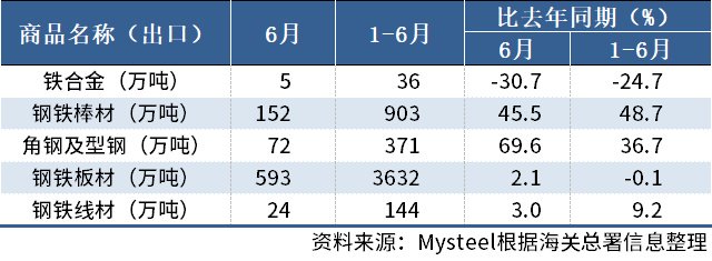 6月,中国出口钢铁棒材152万吨,同比增长45.5%;1-6月累计出口903万吨,同比增长48.7%。其他出口情况如下表所示: