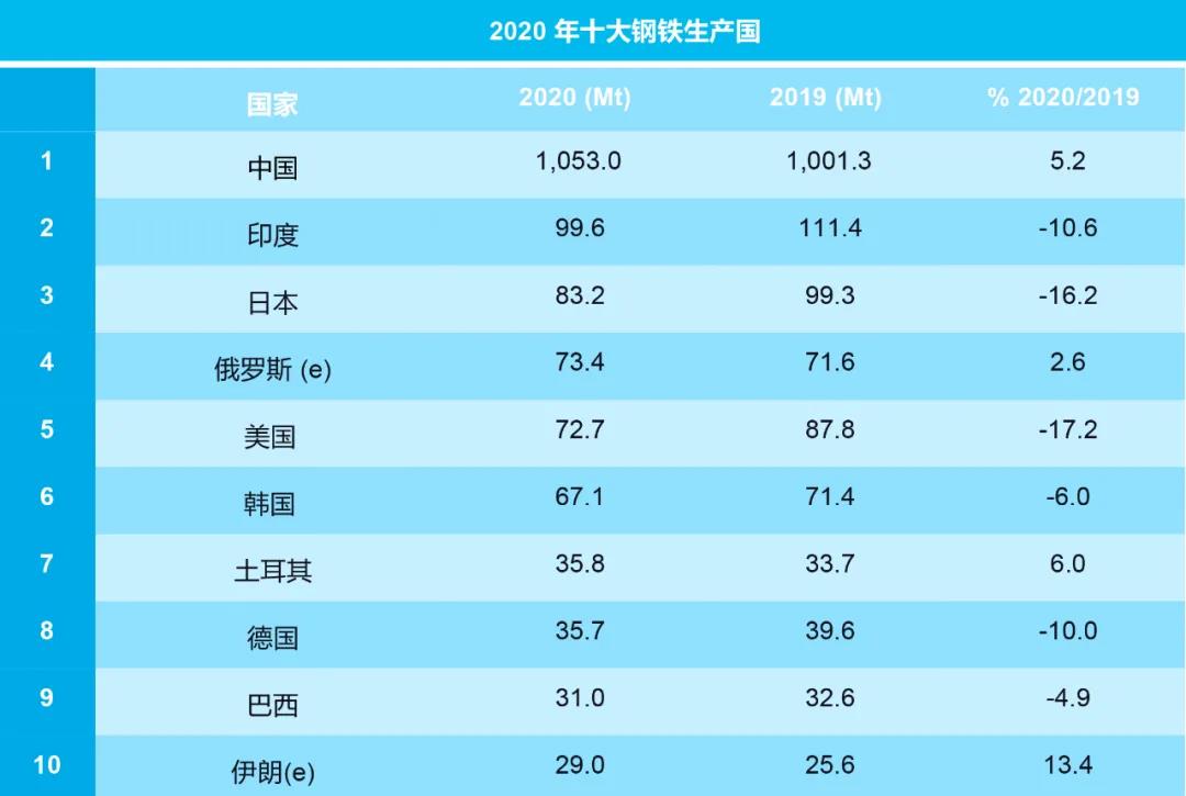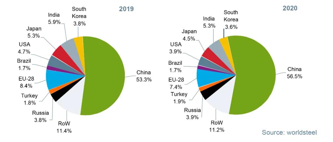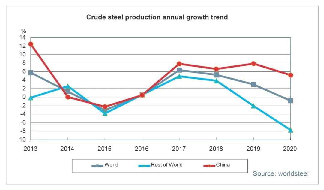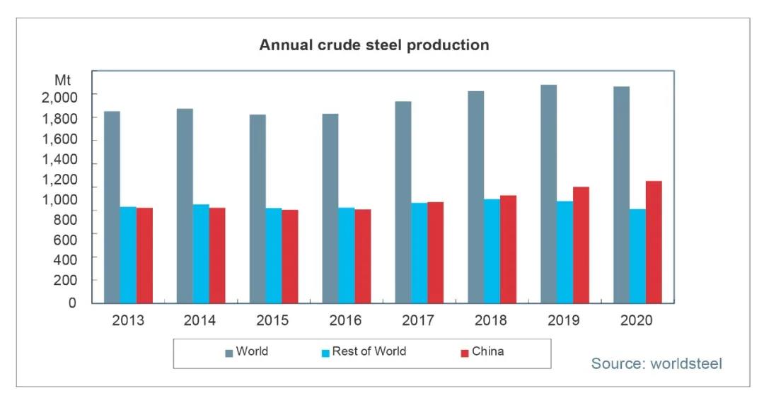 2020年全球粗钢产量达到18.64亿吨,同比下降0.9%。
