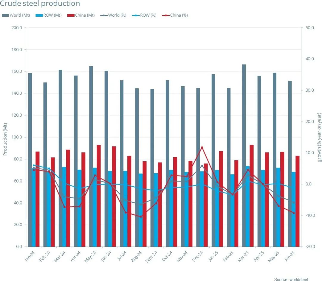 2025年6月全球70个纳入世界钢铁协会统计国家/地区的粗钢产量为1.514亿吨,同比下降5.8%。