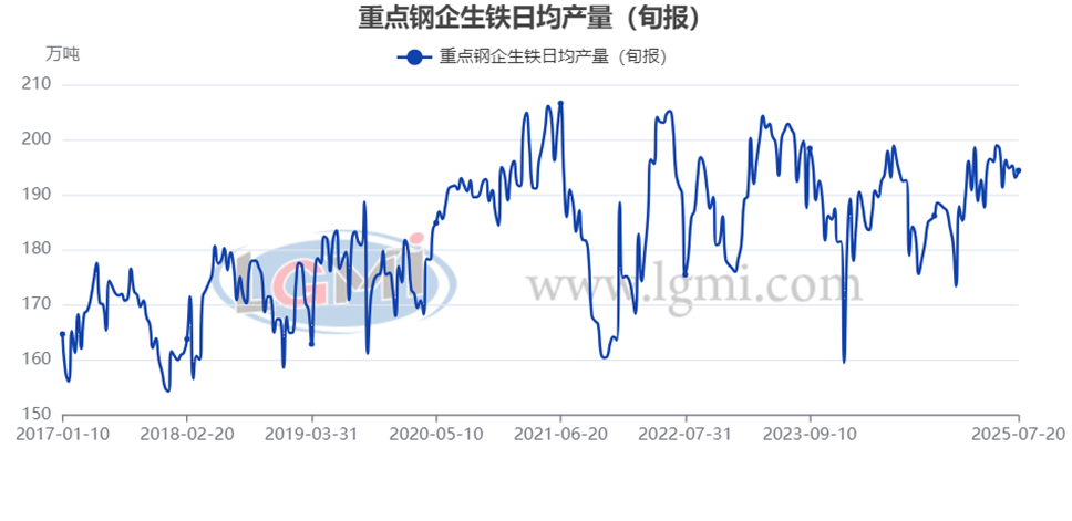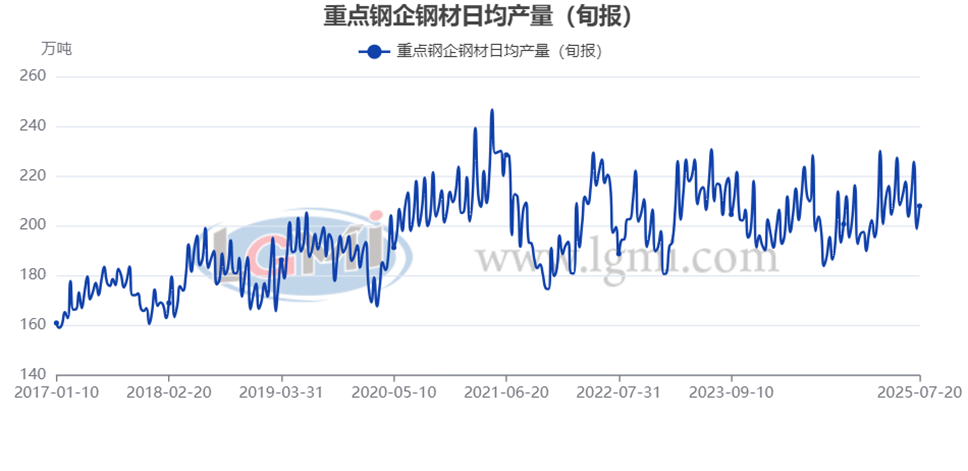 据中国钢铁工业协会统计数据显示,2025年7月中旬重点钢企生铁日均产量194.4万吨,旬环比上升0.6%,同比上升0.9%;7月中旬重点钢企粗钢日均产量214.1万吨,旬环比上升2.1%,同比下降0.3%;7月中旬重点钢企钢材日均产量208.0万吨,旬环比上升4.6%,同比上升2.1%。