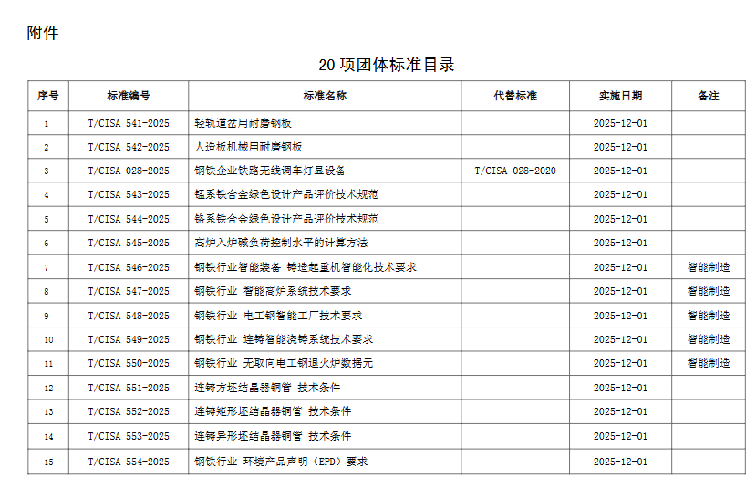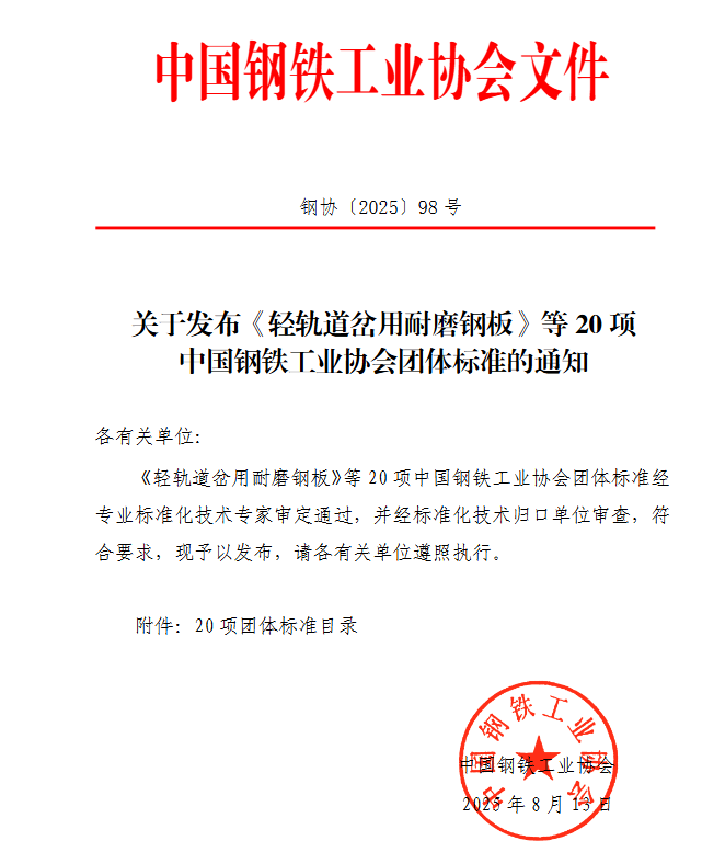 中钢协发布《轻轨道岔用耐磨钢板》等20项中国钢铁工业协会团体标准。