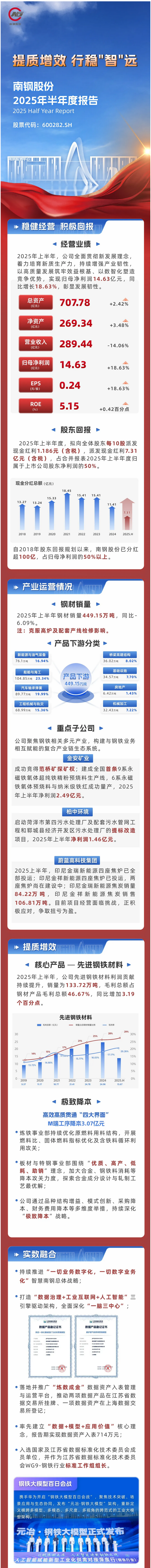 南钢股份8月19日晚间发布半年度业绩报告称,2025年上半年营业收入约289.44亿元,同比减少14.06%;归属于上市公司股东的净利润约14.63亿元,同比增加18.63%。