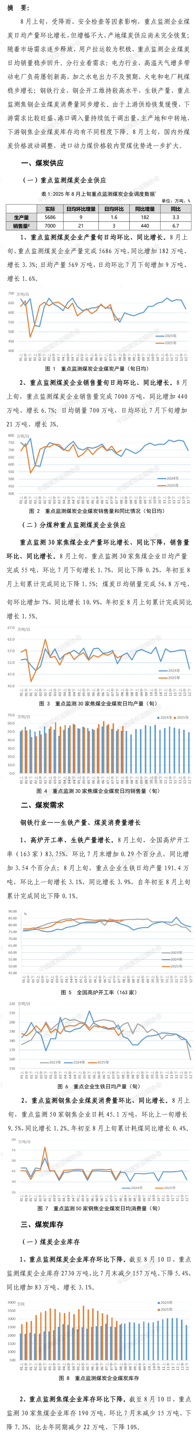 据中国煤炭运销协会消息,8月上旬,重点监测煤炭企业产量完成5686万吨,同比增加182万吨、增长 3.3%;日均产量569万吨,日均环比7月下旬增加9万吨、增长1.6%。