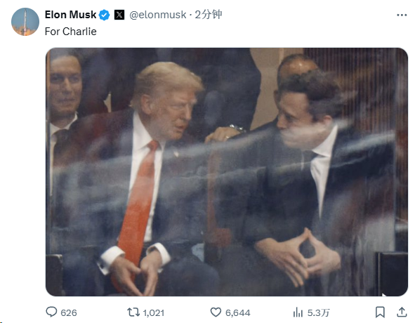 随后马斯克在社交媒体平台“X”上发布自己与美国总统特朗普同框交谈的图片,并表示:“为了查理”(For Charlie)。