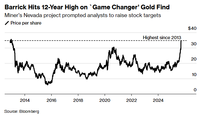 周一,Barrick Mining收涨7.2%,报每股35.36美元,创下自2013年1月以来的最高水平。自上周Fourmile项目的消息发布以来,该股已累计上涨23%。创纪录的金价同样推动了股价走高。