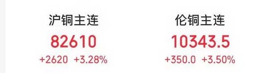商品方面,全球铜价大幅上涨。伦铜价格涨3.50%,创2024年6月以来最高水平;沪铜(78500, -860.00, -1.08%)价格涨超3%。