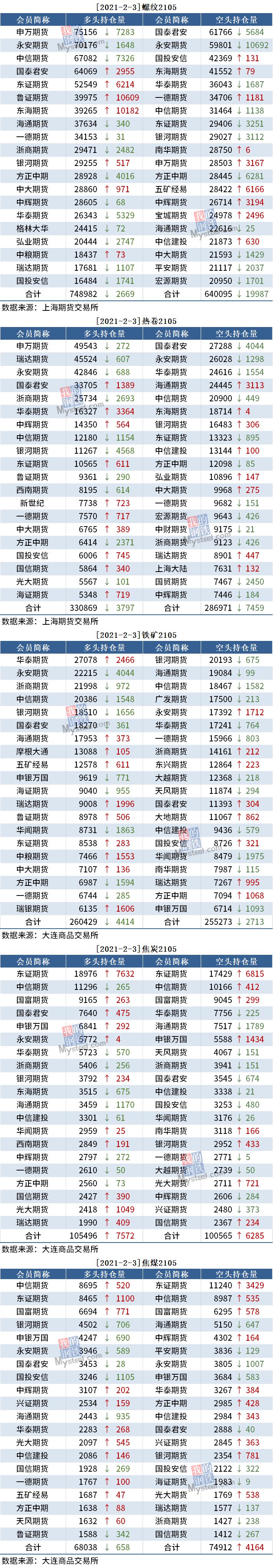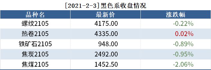 截至2月3日收盘,螺纹2105收4175,跌0.22%;热卷(4335, 1.00, 0.02%)2105收4335,涨0.02%;铁矿(948, -8.50, -0.89%)石2105收948,跌0.89%。