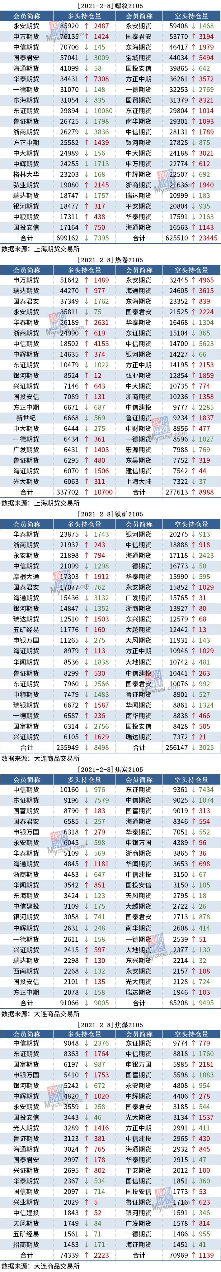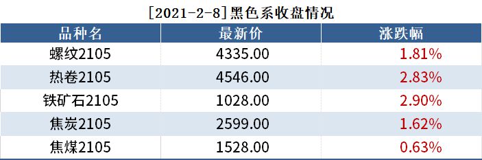 截至2月8日收盘,螺纹2105收4335,涨1.81%;热卷(4546, 125.00, 2.83%)2105收4546,涨2.83%;铁矿(1028, 29.00, 2.90%)石2105收1028,涨2.9%。