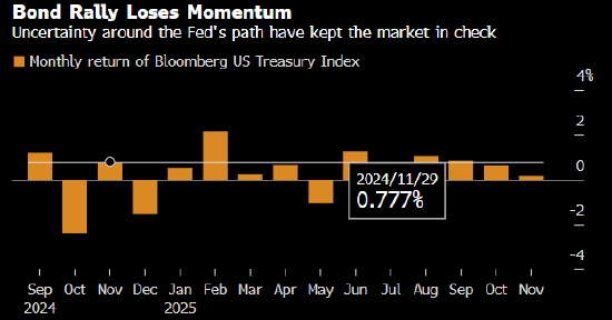 本周市场将迎来感恩节假期,彭博美债基准指数11月势将小幅上涨,在此前十个月中有八个月上涨。然而,尽管债市整体基调依然乐观,但该指数仍低于10月高点,收益率也处于区间震荡。