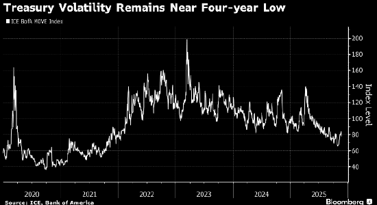市场信心的缺失反映在债券市场波动性指标上。尽管上个月触及四年低点后有所回升,但市场波动率仍接近历史低位。