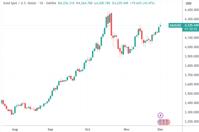 与此同时,现货黄金日内最高摸到每盎司4245美元,也是10月中旬创历史高位之后的六周新高。