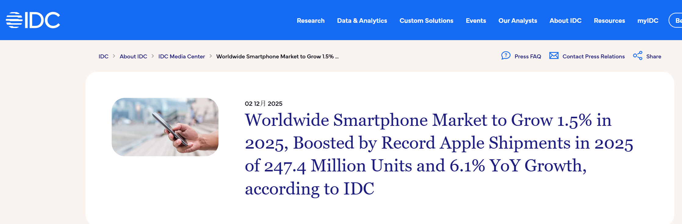 IDC预计,2025年全球智能手机出货量预计将增长1.5%至12.5亿部,这得益于苹果的强劲销售表现、主要新兴市场的快速增长和中国市场的反弹。