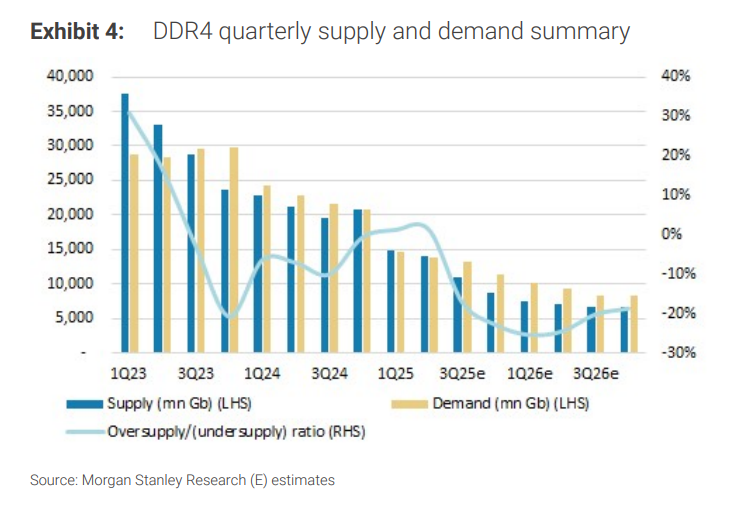与此同时,减产效应正在全面扩散至Flash产品。由于晶圆价值较低且后端封测价格上涨,NOR Flash供应商正将产能重新分配至其他产品。大摩预测,2026年NOR的供应缺口将从低至中个位数扩大到“高个位数”,并推动其价格在明年一季度上涨超过20%。