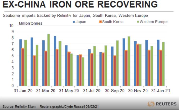 中国1月份的炼钢原料海运进口量为9879万吨,这意味着世界其他地区的进口量为3521万吨。