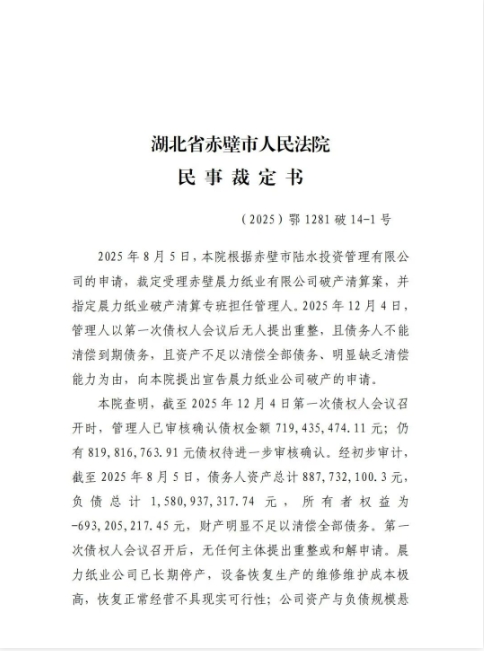 2025年12月4日,赤壁晨力纸业有限公司第一次债权人会议依法召开。会议结束后,无任何主体提出重整或和解申请。