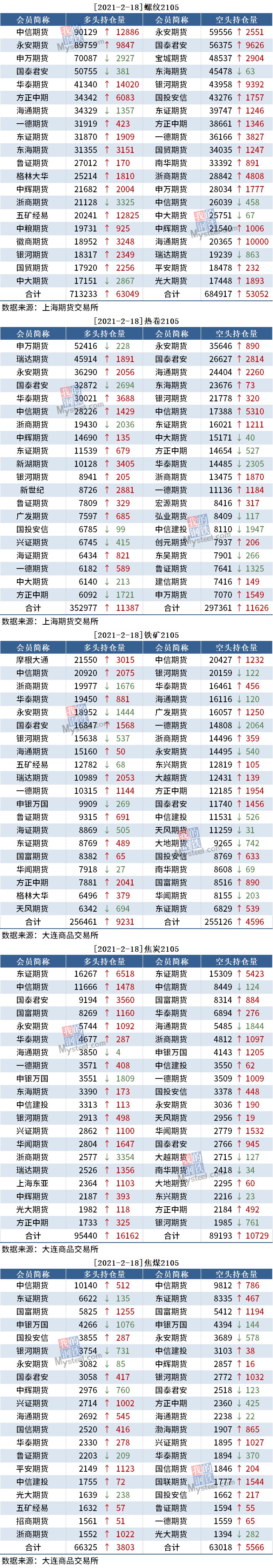 截至2月18日收盘,螺纹2105收4529,涨3.26%;热卷(4708, 115.00, 2.50%)2105收4708,涨2.5%;铁矿(1132, 74.50, 7.05%)石2105收1131.5,涨7.05%。