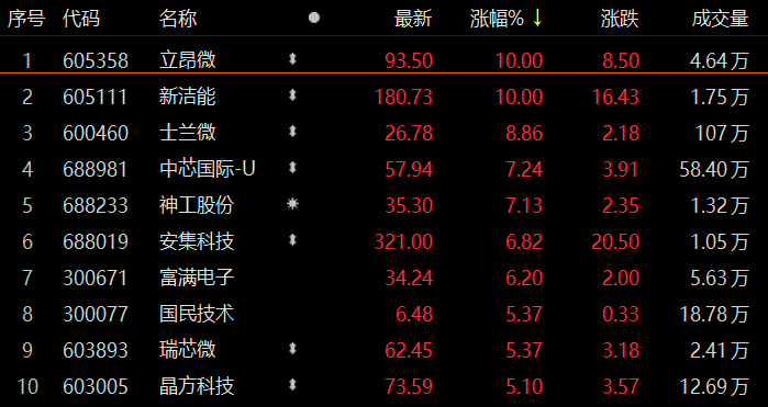 节后A股首个交易日,半导体板块延续节前涨势,其中汽车芯片相关个股表现最为亮眼,立昂微、新洁能开盘半小时率先涨停,士兰微早盘一度逼近涨停,科创板中芯国际、安集科技等涨超5%。