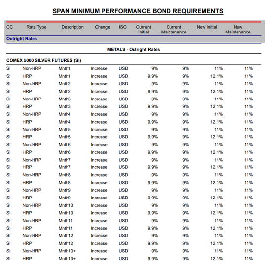 1月28日讯,芝加哥商品交易所(CME)当地时间27日发布通知,对部分白银(8131, -9.00, -0.11%)、铂金和钯金期货合约的保证金(Outright Rates)参数进行调整。文件显示,部分白银合约的新保证金比例高于此前水平,约为名义价值的11%。新标准将于当地时间1月28日收盘后生效。本次通知未涉及黄金(582, 8.80, 1.54%)相关合约。