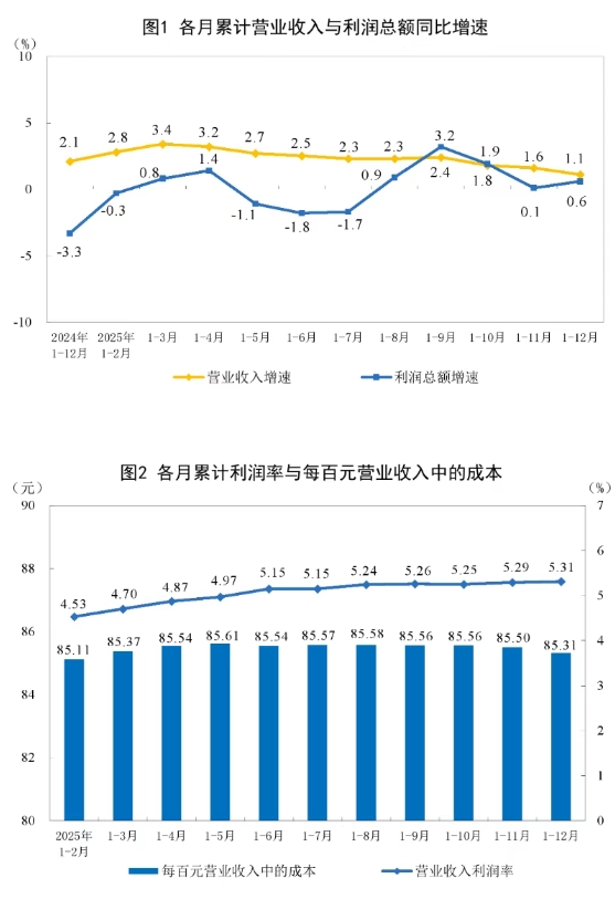 2025年,规模以上工业企业每百元营业收入中的成本为85.31元,比上年增加0.16元;每百元营业收入中的费用为8.62元,比上年减少0.02元。