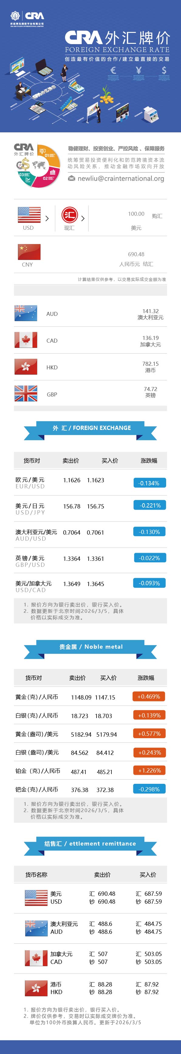 3月5日CRA贵金属及外汇市场价