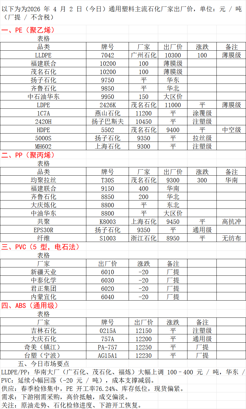 2026年4月2 CRA塑料企业市场报价