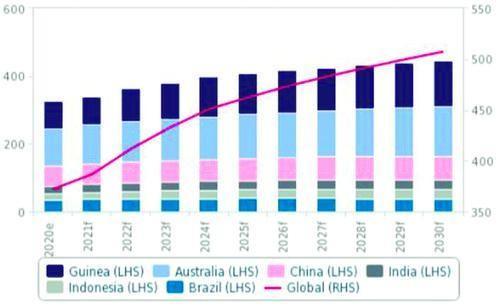 惠誉(Fitch Solutions)在其最新的行业报告中预测,由于几内亚、印度尼西亚和澳大利亚等主要生产商的新项目即将投产,加上印度和印度尼西亚的产量增加,未来几年全球铝土矿产量将稳步增长。加拿大矿业网也认为,铝土矿开采将成为十年内全球采矿业增长最快的部门之一,而推动这一进程的领头羊将是澳大利亚和几内亚这两个世界上最大的铝土矿供应商。