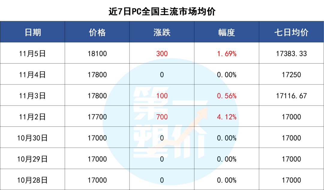 本周国内PC市场涨势猛烈,多牌号不乏千元涨幅出现。整体周均价涨1000元/吨。