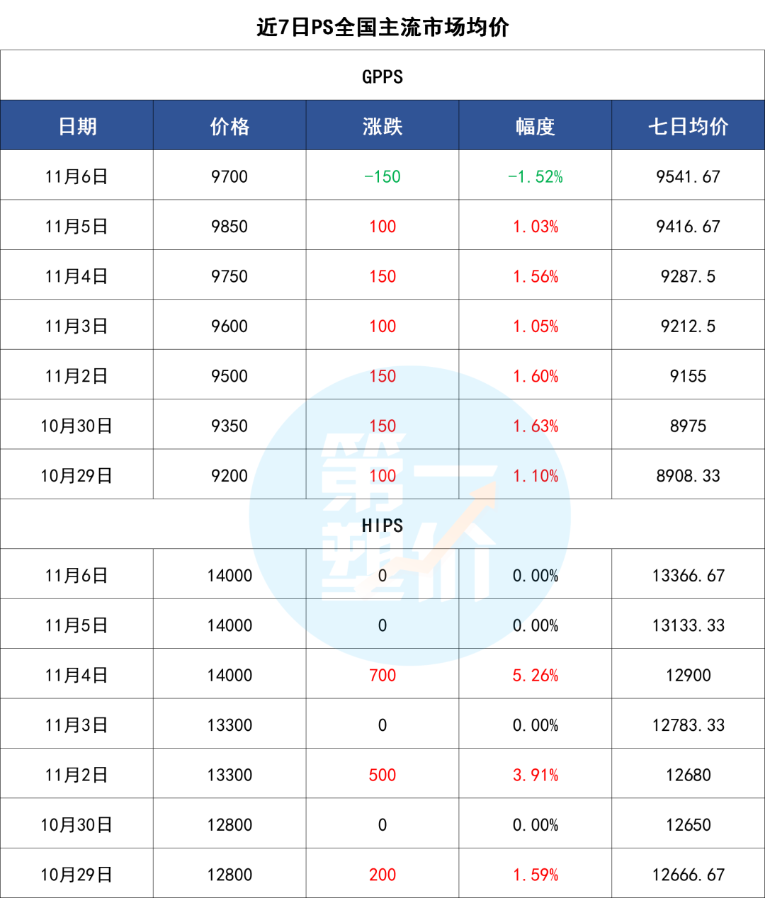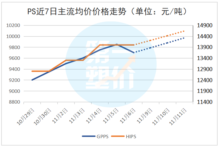 本周PS价格继续上涨。GPPS周均涨600元/吨,HIPS周均涨750元/吨。
