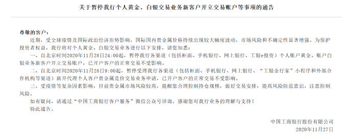 其中,工行公告称,自北京时间2020年11月28日24时起,暂停该行各渠道(包括柜面、手机银行、网上银行、工银e投资)个人账户黄金、账户白银业务新客户开立交易账户,已开户客户的正常交易不受影响。11月28日9时起,暂停受理该行各渠道(包括柜面、手机银行、网上银行、“工银金行家”小程序和外部合作机构等渠道)新开代理个人客户贵金属竞价交易业务申请,已开户客户的正常交易不受影响。