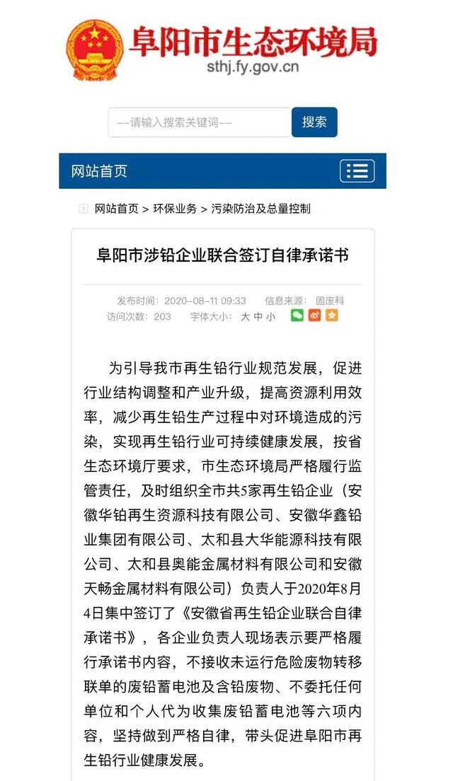 为了减少再生铅生产过程中对环境造成的污染,阜阳市生态环境局组织安徽华铂再生资源科技有限公司等5家再生铅企业负责人于2020年8月4日签订了《安徽省再生铅企业联合自律承诺书》。
