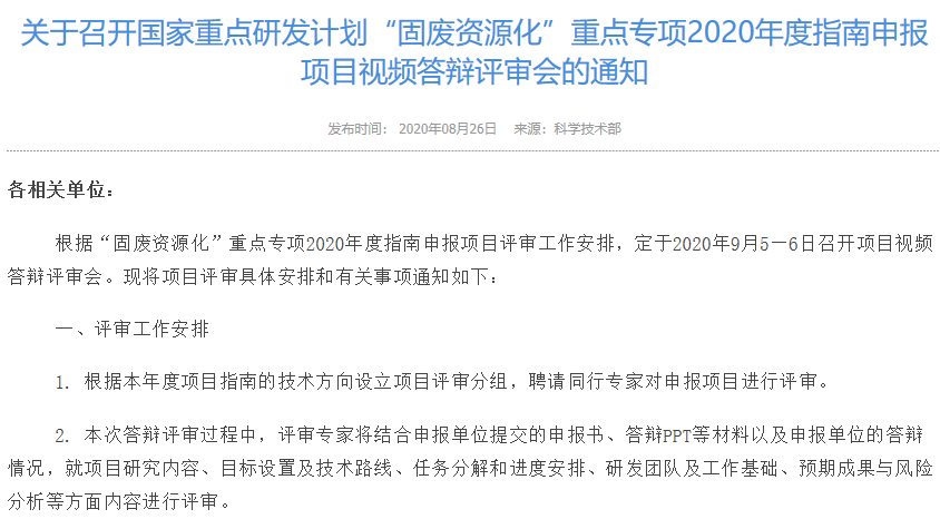 5、“固废资源化”重点专项2020年度指南申报项目视频答辩评审会通知