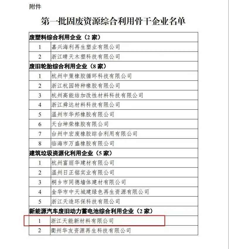 16、天能新材料公司和衢州华友资源公司入选浙江省第一批固废资源综合利用骨干企业名单