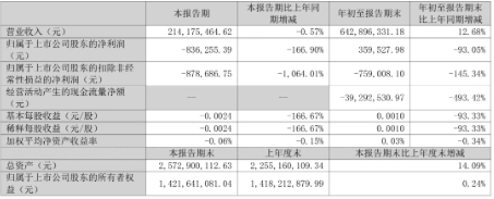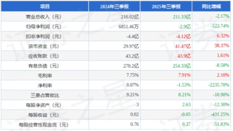 公司营业总收入211.33亿元,同比下降2.17%,归母净利润-2.9亿元,同比下降522.74%。