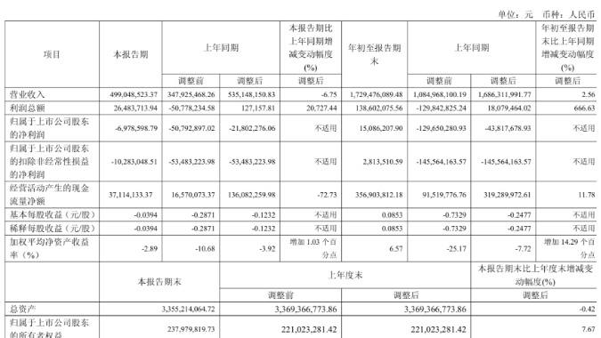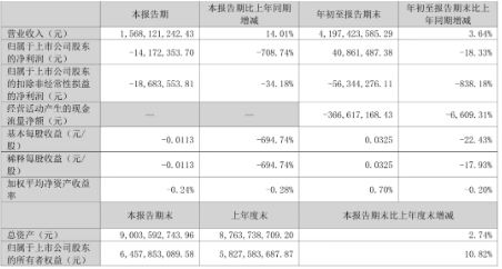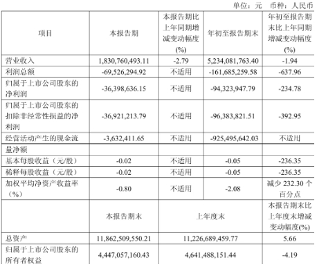 公司实现营业总收入52.34亿元,同比下降1.94%;归母净利润亏损9432.39万元,上年同期盈利6998.55万元。