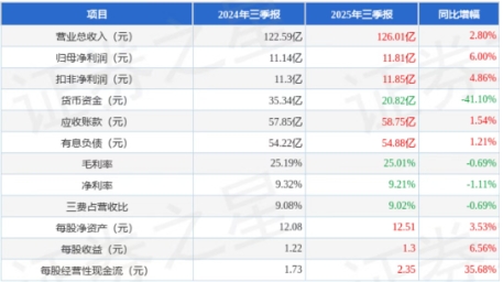 公司营业总收入126.01亿元,同比上升2.8%,归母净利润11.81亿元,同比上升6.0%。