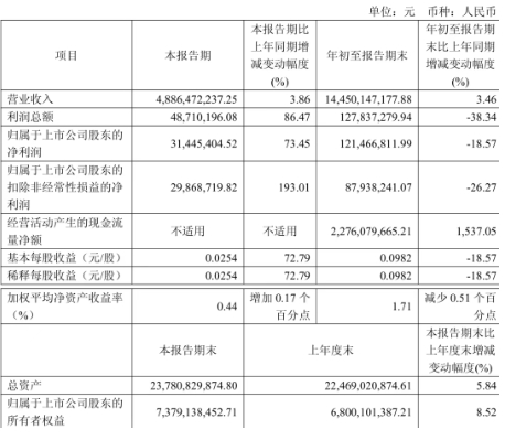 公司实现营业总收入94.81亿元,同比下降1.49%;归母净利润7258.66万元,同比下降56.68%。