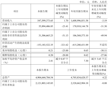 公司实现营业总收入16.09亿元,同比下降3.19%;归母净利润1.71亿元,同比下降31.30%。