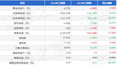 公司营业总收入4.38亿元,同比上升2.66%,归母净利润1742.18万元,同比下降4.83%。
