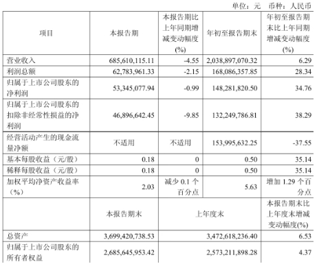 公司实现营业总收入41.97亿元,同比增长3.64%;归母净利润4086.15万元,同比下降18.33%。
