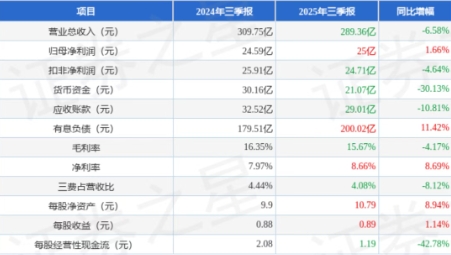 公司营业总收入289.36亿元,同比下降6.58%,归母净利润25.0亿元,同比上升1.66%。