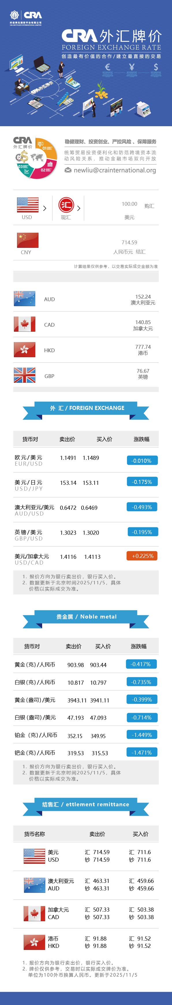 11月5日CRA贵金属及外汇市场价