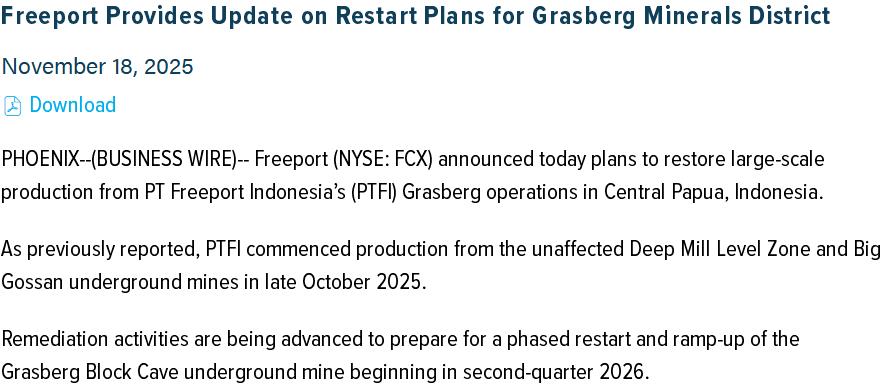根据分阶段重启计划,该公司预计自由港印尼分公司(PT Freeport Indonesia)2026年铜和黄金总产量将大致持平于2025年水平,约为10亿磅铜和90盎司黄金。自由港印尼分公司拥有Grasberg矿,该公司大部分股权由政府控制,占比51.2%,剩余股份由自由港公司控制,同时经营该矿。